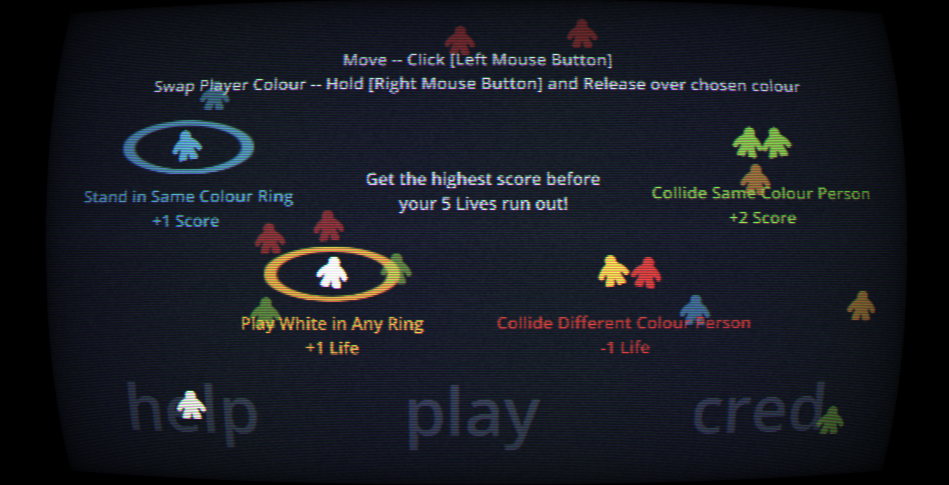Be a tiny person in the crowd. Score points by matching the colour of the rings you stand in and the colours of the people around you.